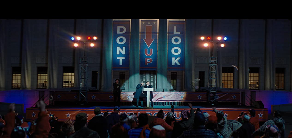 이후 한 편에서는 혜성 충돌의 심각성을 알리기 위해 하늘을 올려다 보라는 ‘Just Look Up’을 외치고, 다른 한 편에서는 하늘을 보지 말라는‘Don’t Look Up’을 외치며 대중은 두 편으로 갈라지게 됩니다. 이렇게 혜성 충돌이라는 인류의 존재를 위협하는 심각한 문제가 정치적 이슈로 뒤덮이고, 점점 갈등이 심해집니다.
