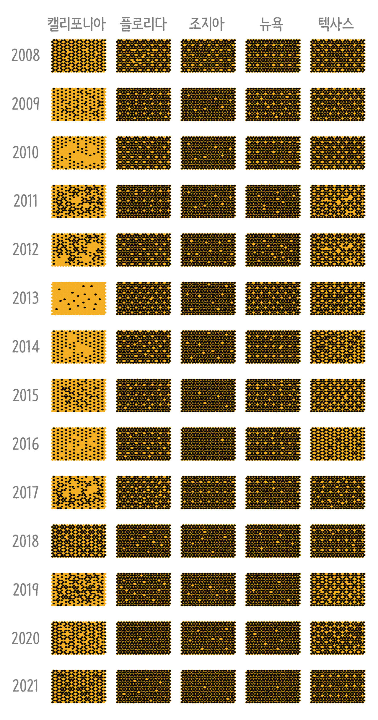 전남: 전남 지역 벌통의 43%에서 꿀벌이 집단 실종. 피해 벌통 규모는 무려 10만 5,900여 군.