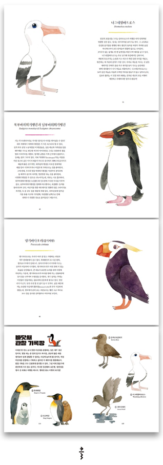 무엇보다 이 책은 누구나 아는 인기 만점 황제펭귄부터 들어본 적 있나 싶은 낯선 이름과 생김새를 한 아메리카군함조까지 소개하며, 지구에서 가장 척박한 곳에 사는 생명체인 그들에 대한 애정과 경외의 마음을 잘 표현했다. “펭귄이 단지 귀여운 새가 아닌 훨씬 더 많은 것은 지닌 생명체라는 사실을 알게 되기를 바란다”는 작가의 바람도 깊숙하게 전해진다.