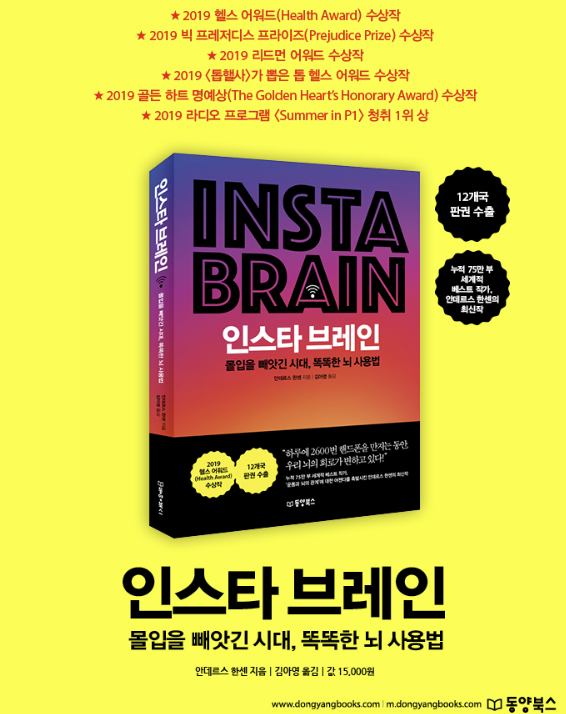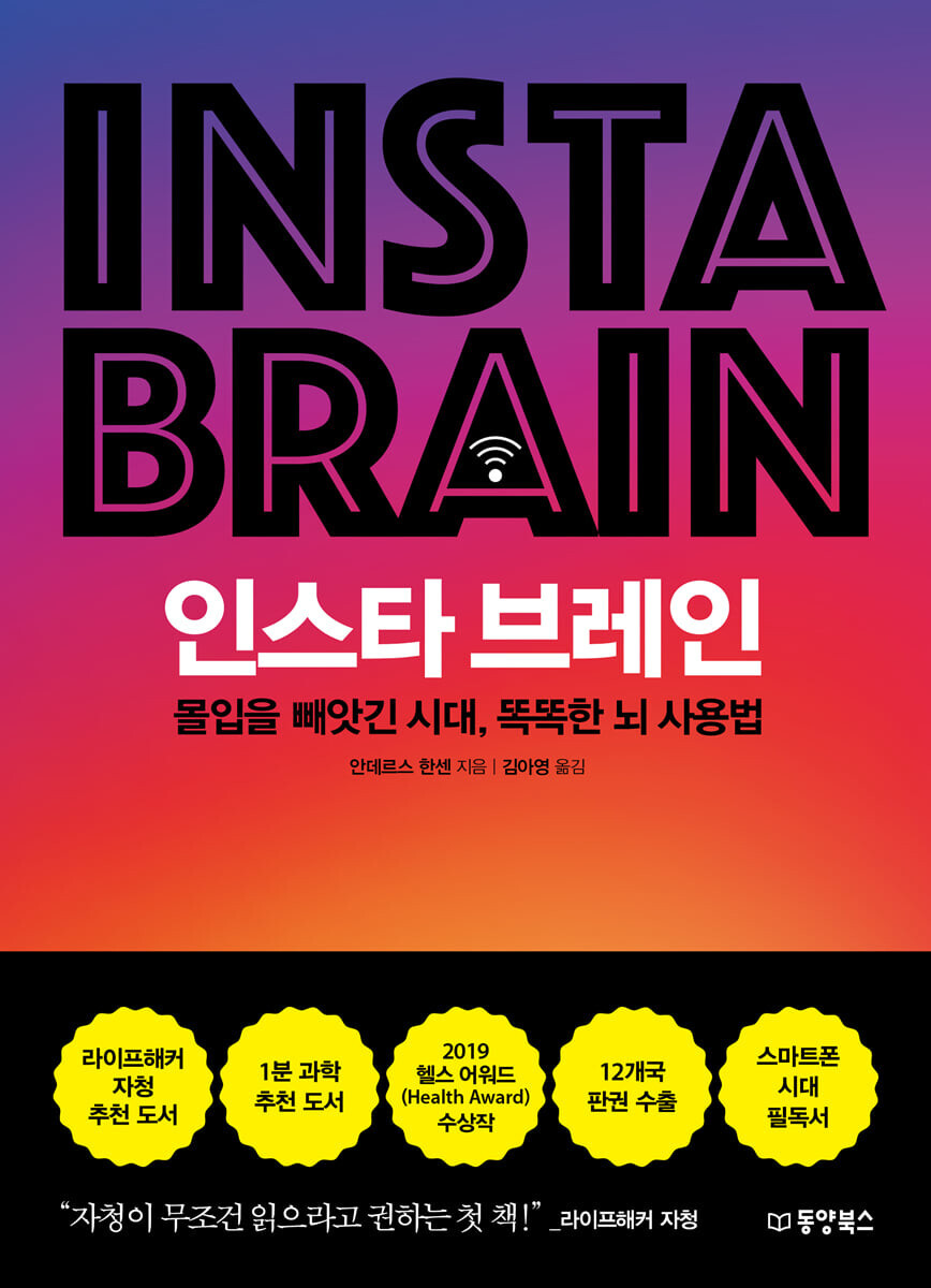 스웨덴 출신의 세계적 작가이자 정신과 의사, 안데르스 한센은 바로 이 문제를 집중적으로 파고들었다. 그는 어느 날, 좀처럼 책에 몰두하지 못하고, 자꾸만 별 이유 없이 스마트폰을 만지는 자기 자신의 모습을 ‘깨닫고’ 충격을 받은 나머지 이 문제에 대해 뇌 과학적인 분석을 하기 시작했고, 이 책, 『인스타 브레인(원제: SKARMHJARNAN; SCREEN BRAIN)』을 쓰게 되었다. 간단하게 이야기하자면, 스마트폰은 우리가 과거보다 덜 자게 만들고, 덜 움직이게 만들었으며, 직접 사람을 만나 교류하는 시간을 단축시켰다. 그런데 아직도 수렵 채집인의 뇌를 갖고 있는 우리는 ‘충분히 자고 싶은 욕구, 몸을 움직이고 싶은 욕구, 사람들과 관계를 맺고 싶은 욕구’를 고스란히 갖고 있기에 불면증과 우울증의 폭발적 증가, 청소년들의 집중력 감퇴와 학력 저하 현상, 디지털 치매 등등은 필연적인 결과라는 것이다. 이 책에는 이 주제에 대한 전 세계의 수많은 연구 결과와 설문 조사, 심리 실험 결과 등등이 집대성돼 있는데, 정신과 의사이자 신경의학자답게 뇌 과학 이론을 접목시켜 독자의 이해를 돕고 있는 것이 가장 큰 장점 중 하나이다.