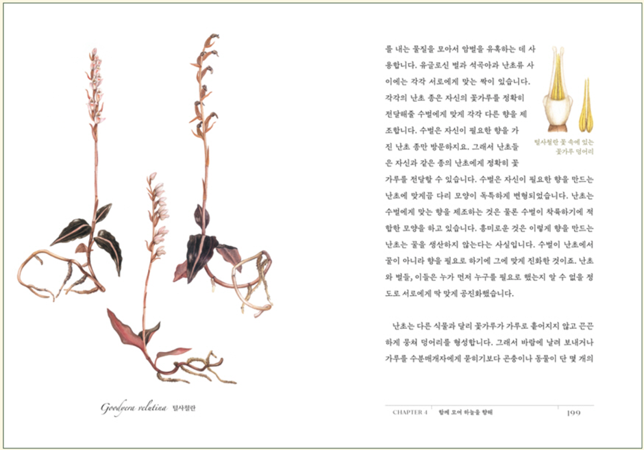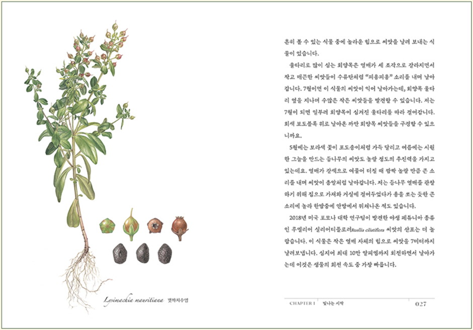 P8. 식물 그림은 그리는 식물 종에 대해 깊이 조사하고 전 생애를 관찰하여 최소 1년에 걸쳐 제작됩니다. 그릴 때는 문헌 조사와 오랜 관찰 많은 표본을 살펴보는 길고 고된 과정이 있습니다. 관찰해야 하는 중요 부분을 놓치기라도 하면 다음 해를 기다려야하기 일쑤이지요. 그런 고된 과정만큼 모든 내용이 집약된 한 장의 그림을 완성하면 더없이 뿌듯합니다.