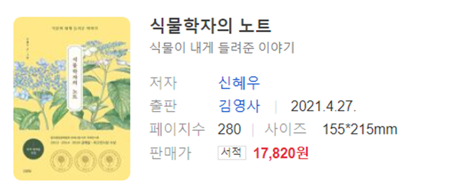 이번에 리뷰할 도서는 식물학자 신혜우 작가의 <식물학자의 노트>입니다. 예전에 리뷰했던 이소정 작가의 <식물의 책>을 읽은 이후로 식물세밀화에 관심이 많아져서 이번 기회에 이 책을 읽게 되었습니다. 신혜우 작가는 <랩걸>의 표지를 그린 것으로도 잘 알려져 있습니다.