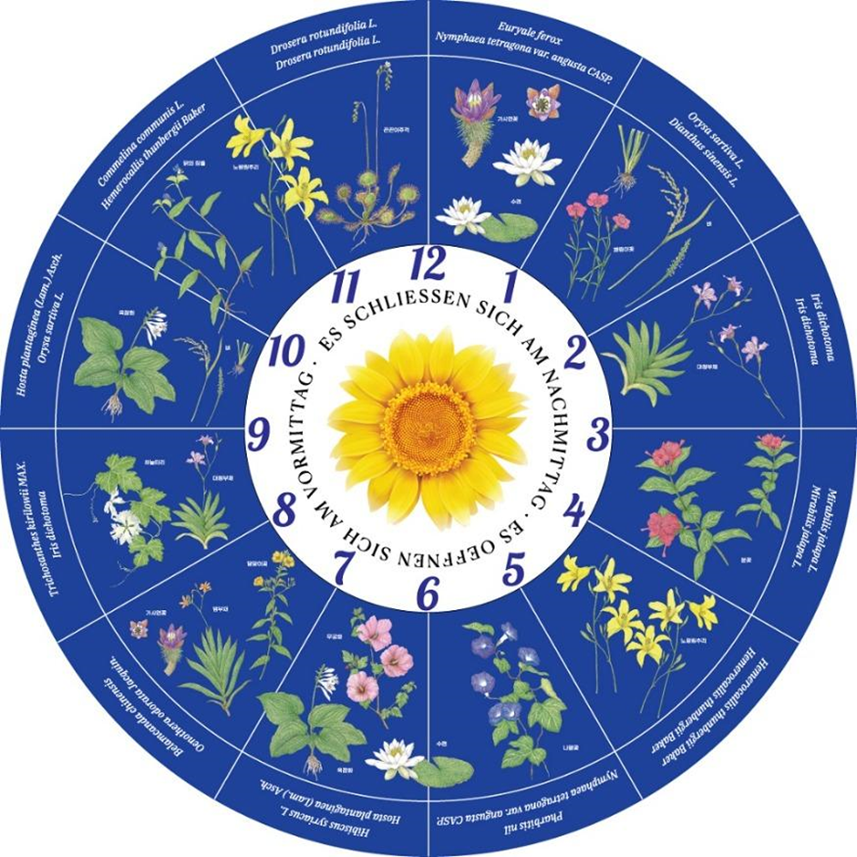 P33. 생물분류학의 기초를 확립하였고, ‘식물학의 시조’라고 불리는 스웨덴 식물학자 칼 폰 린네Carl von Linne∙1707~1778는 하루 동안 꽃이 피고 지는 시간을 기록했습니다. 그리고 이런 시간을 이용해 꽃시계를 만들 수 있음을 제안하였지요. 방가지똥, 치커리, 서양민들레, 백수련 등 피고 지는 시간이 다른 마흔여섯 종의 꽃으로 시계를 만들었습니다.