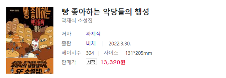 2005년 ‘환상문학웹진 거울’에 소설을 발표한 이래, 일곱 권의 소설집과 장편소설을 발표했으며 논픽션과 과학 저술도 게을리하지 않는 전방위적 작가 곽재식. 그의 작품세계는 여전히 변화무쌍하다. 시간여행과 아포칼립스, 외계인이 등장하는 등 SF적 성격이 다분하지만, 그의 SF는 대단히 친숙하고 일상적이다. 그리고 무엇보다도 재미있다. 달콤한 과자에 손이 가듯 한 장 두 장 읽다 보면 어느새 상상력 가득한 결말에 이르는 여덟 번째 소설집 《빵 좋아하는 악당들의 행성》이 비채에서 출간되었다. 치킨집, 사무실, 관공서처럼 리얼한 장소를 배경으로 곽재식 특유의 과학적 상상, 대체 불가한 유머가 펼쳐지는 생활밀착형 SF 소설집이다. 〈심야괴담회〉 〈유 퀴즈 온 더 블럭〉 등 방송에서도 입담을 과시해온 작가는 자신의 본진인 소설에서 이야기꾼의 면모를 본격적으로 발휘한다.