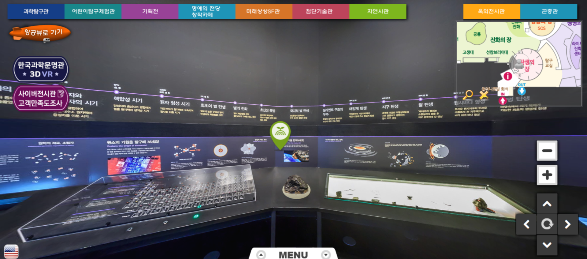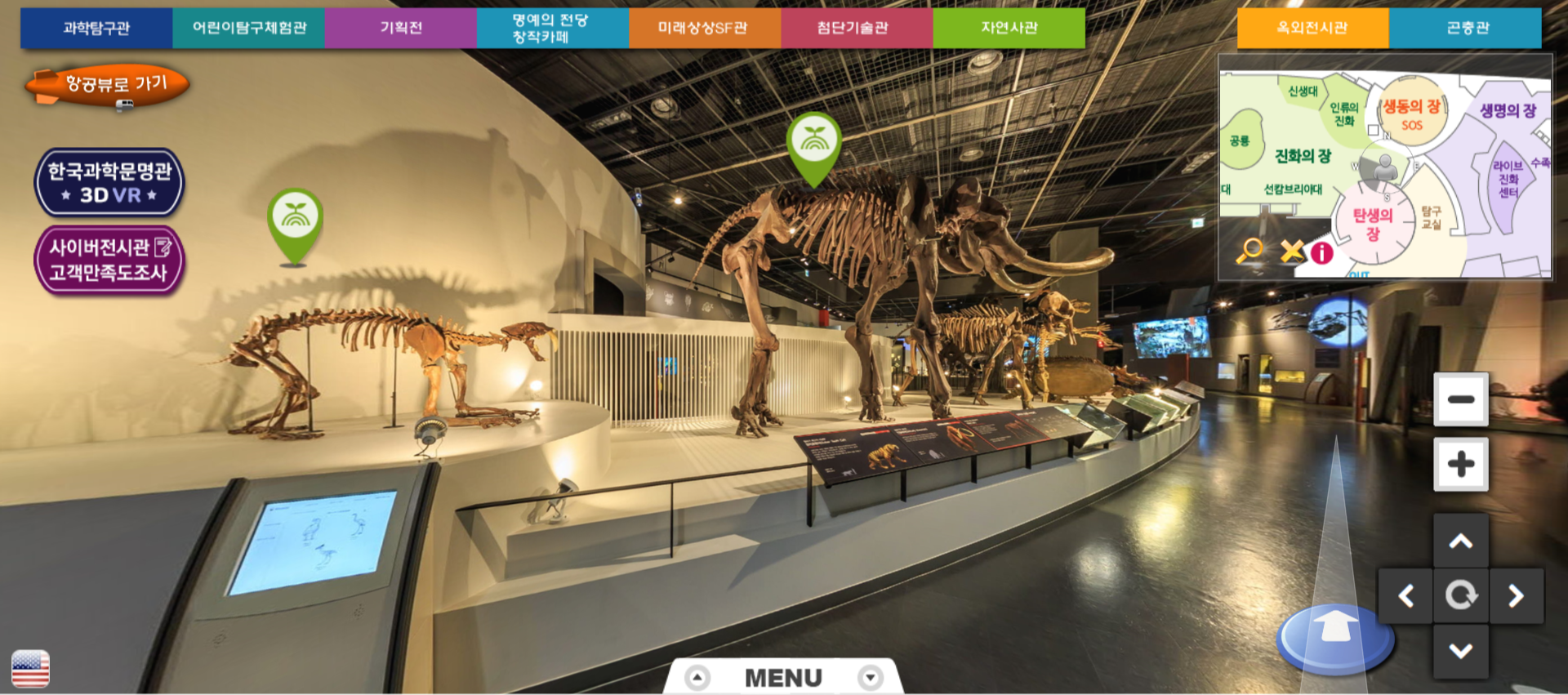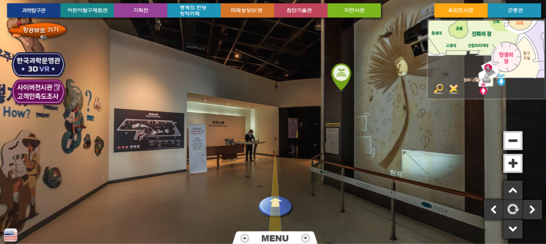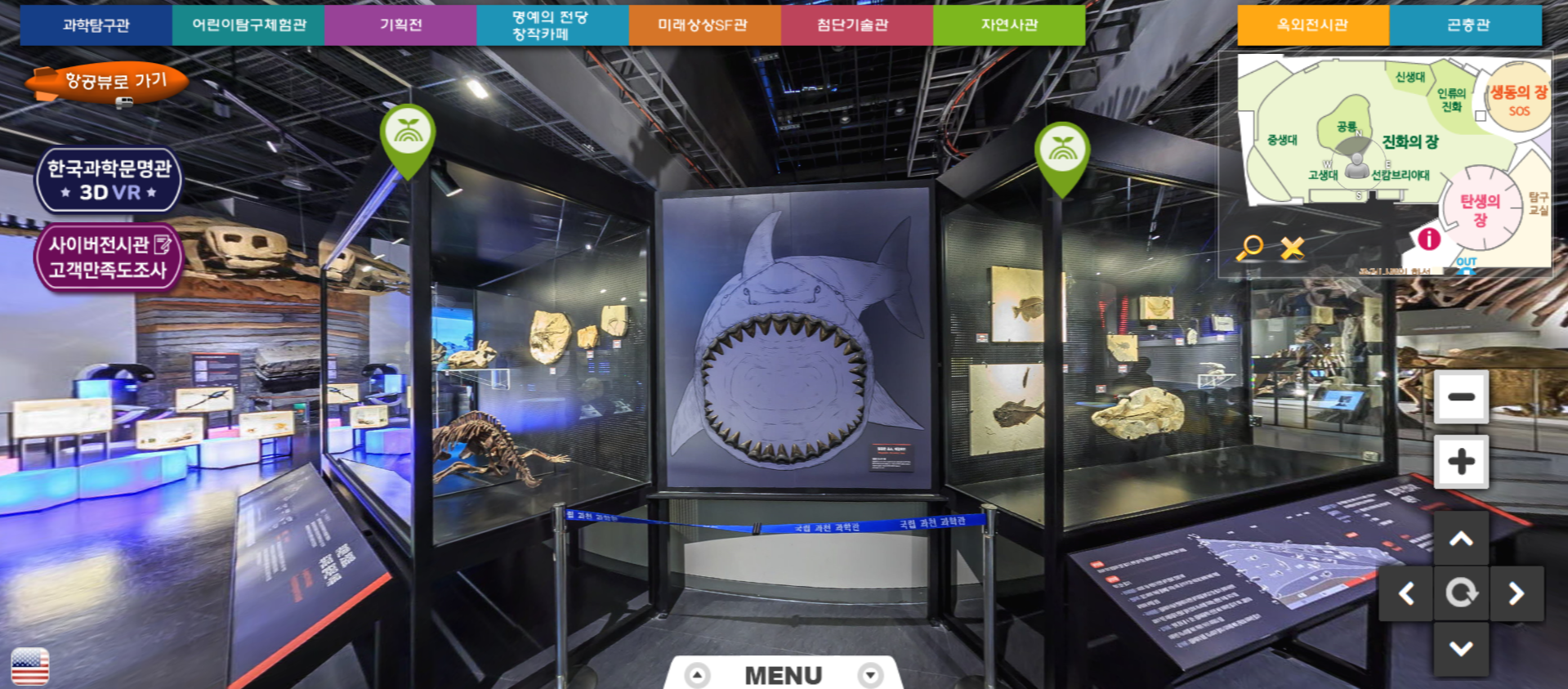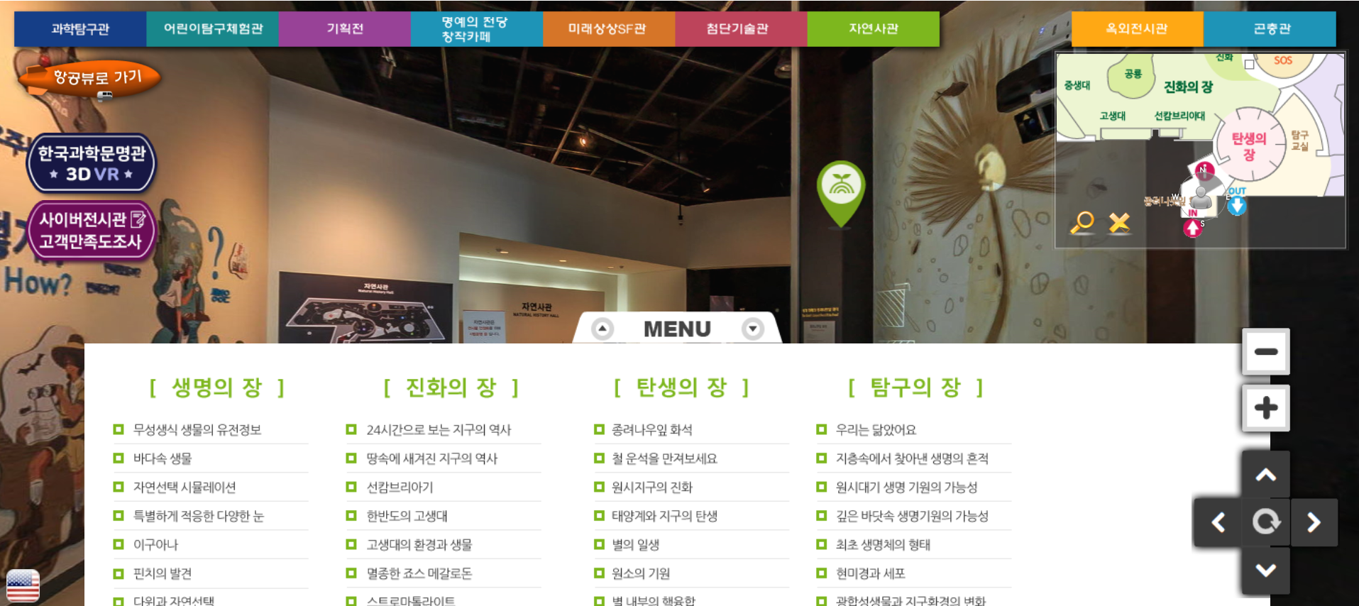 아래의 메뉴 버튼을 눌리면 자연사관에서 어떤 전시들을 다루고 있는지 확인할 수 있습니다. 자연사관은 생명의 장, 진화의 장, 탄생의 장, 탐구의 장으로 나눠져 있습니다.