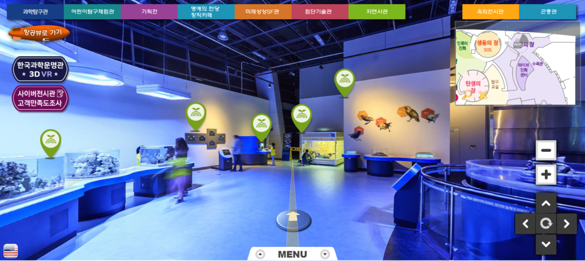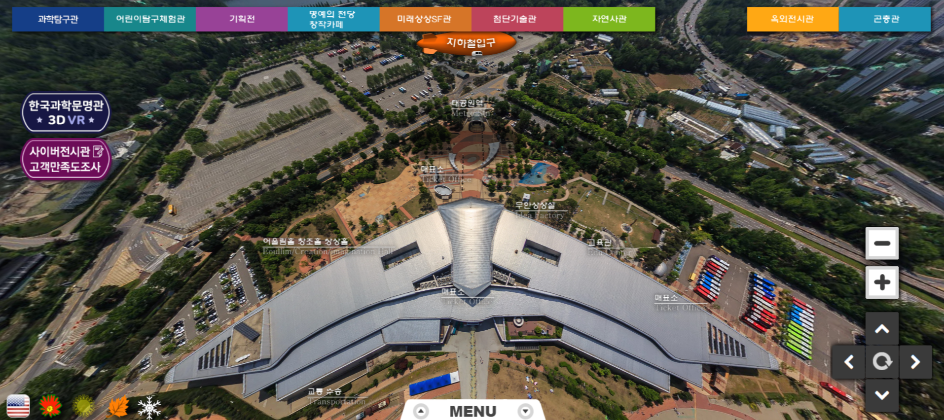위에 첨부한 링크를 눌러 국립과천과학관 VR 체험관 홈페이지로 들어가면 다음과 같은 첫 화면이 나타납니다. 국립과천과학관을 위에서 찍은 항공샷의 모습이 보이며 마우스를 움직여 여러 방면의 전경을 확인할 수 있습니다. 왼쪽 하단의 아이콘을 통해 봄, 여름, 가을, 겨울의 과천과학관의 모습도 확인할 수 있네요. 위쪽 메뉴 부분에는 과학탐구관, 어린이탐구체험관, 기획전, 미래상상SF관, 첨단기술관, 자연사관, 한국과학문명관을 비롯해 옥외전시관, 곤충관까지 나눠져 있으며, 클릭하면 각 관을 VR로 체험해 볼 수 있습니다.