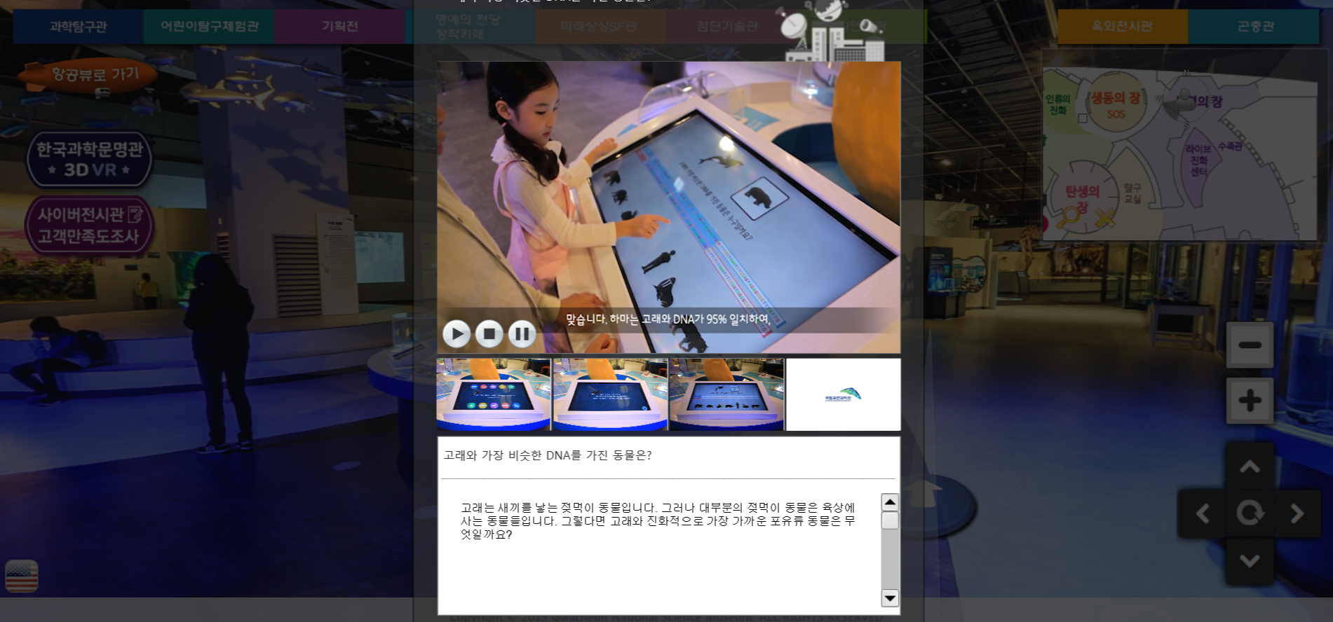 전시 설명 중 '고래와 가장 비슷한 DNA를 가진 동물은?' 이라는 질문에 대한 대답이 나와 있지 않아 직접 가지 않으면 알 수 없는 것인가 했는데, 동영상을 통해 '하마와 고래의 DNA는 95% 일치한다'는 사실을 확인할 수 있었습니다. 하지만 역시 과학관을 방문하여 동영상을 가까이서 보고 직접 정답을 맞추는 것이 더 즐거울 것이라 생각됩니다.