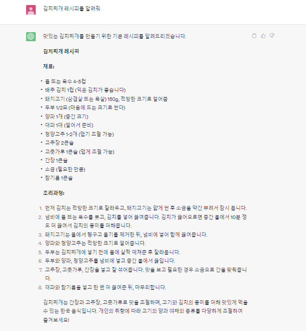 "김치찌개 레시피를 알려줘" 라고 질문하면 됩니다.