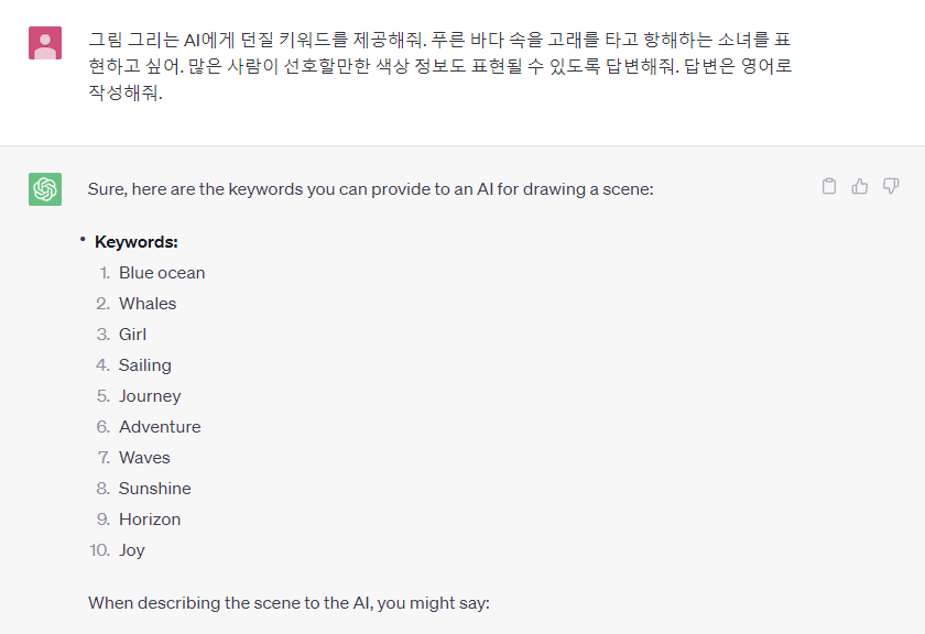상세한 설명을 덧붙인다면 영화 시놉시스나 노래 가사 작문을 해줍니다.