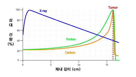 브래그피크 원리를 이용해 정상 조직에 영향을 주지 않고 암세포를 사멸시키는 원리는 기존 양성자치료기와 유사하나 암세포에 대한 파괴력이 더 큰 것이 특징입니다.