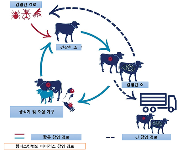 럼피스킨병은 주로 모기, 진드기 등 흡혈 곤충에 의해 전파되며
