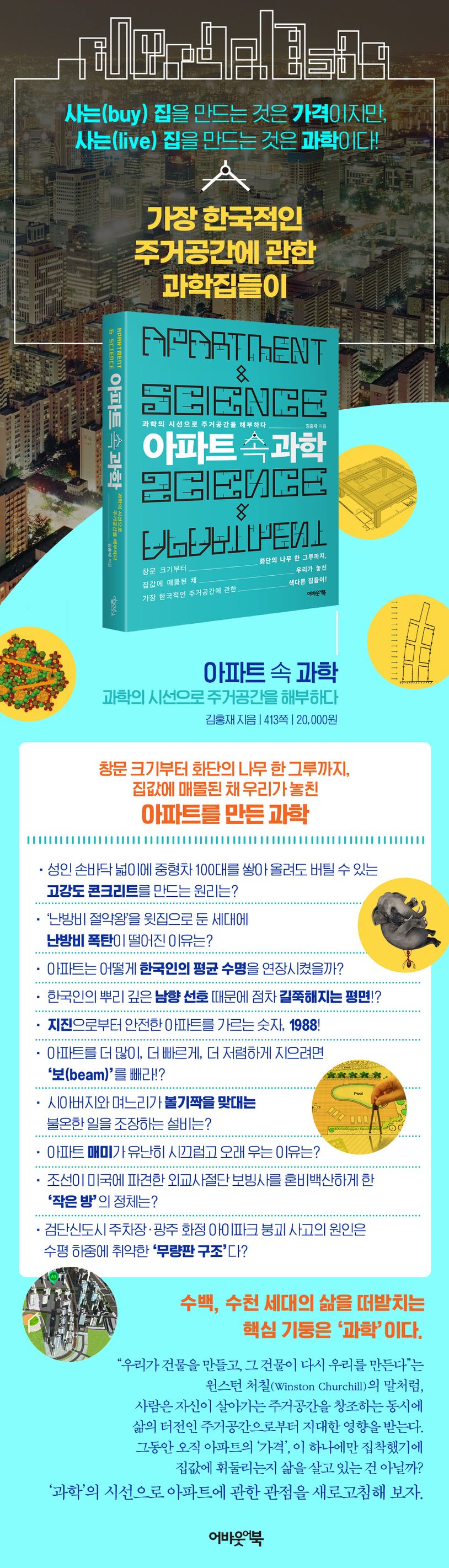 아파트의 뼈와 살을 이루는 콘크리트에는 나노과학이, 건물 사이를 흐르는 바람에는 전산유체역학이, 열효율을 높이고 층간소음을 줄이는 벽과 바닥에는 재료공학이 숨어 있다. 오늘날 수많은 학문의 성취가 아파트에 담겨 있다. 과학의 시선으로 아파트를 구석구석 탐사하는 색다른 집들이에 여러분을 초대한다.