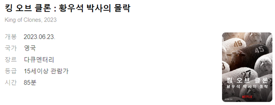 이번에 리뷰할 다큐멘터리는 <킹 오브 클론: 황우석 박사의 몰락>입니다. 황우석 박사는 현재까지 우리나라 과학계에 가장 큰 파장을 일으킨 인물이 아닐까 싶습니다. 이 다큐멘터리는 위의 설명에서 볼 수 있듯이 황우석 박사의 동물 복제 연구와 윤리적 문제로 인한 몰락, 그리고 그 이후의 이야기를 다루고 있습니다.