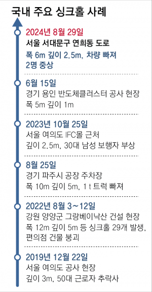 서울 한복판 4차선 도로에서 싱크홀(땅 꺼짐)이 발생해 차량이 통째로 빨려 들어가고 운전자 등 2명이 크게 다쳤다. 서울에서만 최근 10년간 218개의 싱크홀이 발생한 것으로 확…