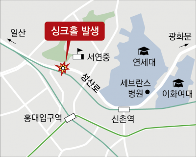 지난달 8월 29일 연희동 성산대교로 향하는 성산로 편도 4차로 가운데 3차로에서 가로 6m, 세로 4m, 깊이 2.5m 크기의 땅 꺼짐(싱크홀)이 발행해 승용차가 통째로 빠지는 사고가 났습니다.