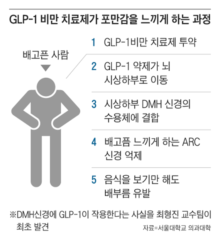 이 GLP-1이 체중을 줄이는 원리는 최형진 서울대 의대 교수와 케빈 윌리엄스 미국 텍사스대 사우스웨스턴메디컬센터 교수 공동 연구진에 의해 최초로 밝혀졌다고 합니다. 이 GLP-1 유사체는 뇌의 시상하부에 위치한 DMH 신경에 작용해 포만감을 높인다고 합니다.