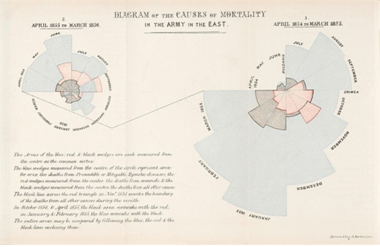 하지만 이 책에서 나이팅게일이 소개된 이유는 단지 헌신적인 간호 때문이 아닙니다. 나이팅게일은 군의 의료 체계를 개혁하기 위해서 왕립 위원회에 보고하기 위해 통계 분석을 바탕으로 크림전쟁에서의 사망 원인에 대한 보고서와 제안서를 작성하였습니다. 이를 위해 나이팅게일은 사회통계학자인 아돌프 케틀레와 편지를 주고받으며 통계학적 접근법을 가다듬었고, 의사이자 통계학자인 윌리엄 파와 함께 표와 그래프를 만들었습니다. 또한 나이팅게일은 수학을 모르는 사람도 통계에 대해서 이해할 수 있게 면적그래프를 활용하였습니다. 이처럼 나이팅게일은 현대 간호학의 창시자이기도 하지만, 보건 의료를 개선하기 위하여 통계를 적극적으로 활용하고 객관적 근거 자료를 바탕으로 하여 과학적 보건 의료를 기초를 세우는데 공헌하기도 했습니다.