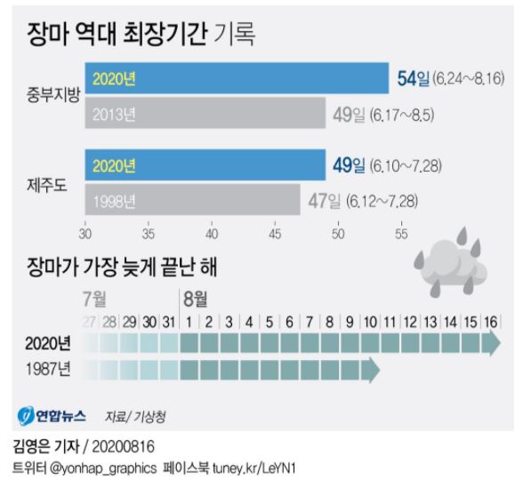 고은지 기자, <중부지방 ‘54일 최장 장마’ 오늘 끝… 비 그치니 푹푹 찐다(종합)>, https://www.yna.co.kr/view/AKR20200815061451530
