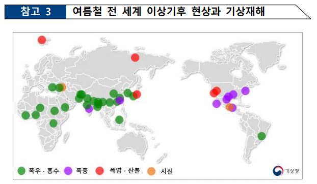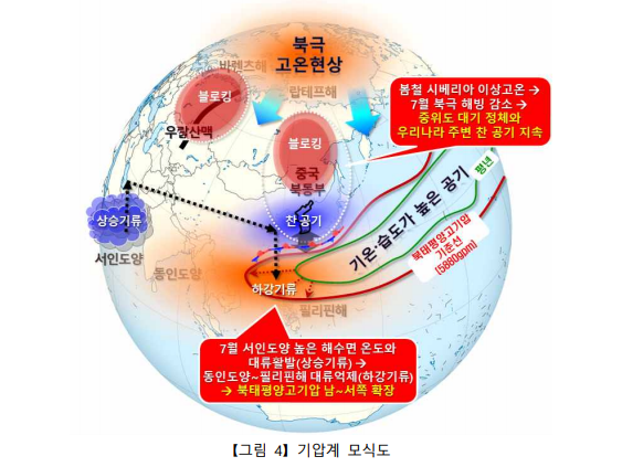 올해 7월, 시베리아 이상고온으로 북극 해빙(海氷)의 면적이 1979년 이후 최저를 기록하면서 우리나라 주변의 편서풍이 약해지고 북쪽으로부터 찬 공기의 유입이 잦았고, 서인도양의 해수면 온도가 높고 대류가 매우 활발해지는 반면, 동인도양과 필리핀해 부근의 대류는 억제됨에 따라, 북태평양 고기압이 남~서쪽으로 크게 확장하였습니다. 이로 인해 우리나라 부근에서 정체전선이 지속해서 활성화되어 장마철이 길게 이어진 것으로 분석되고 있습니다.