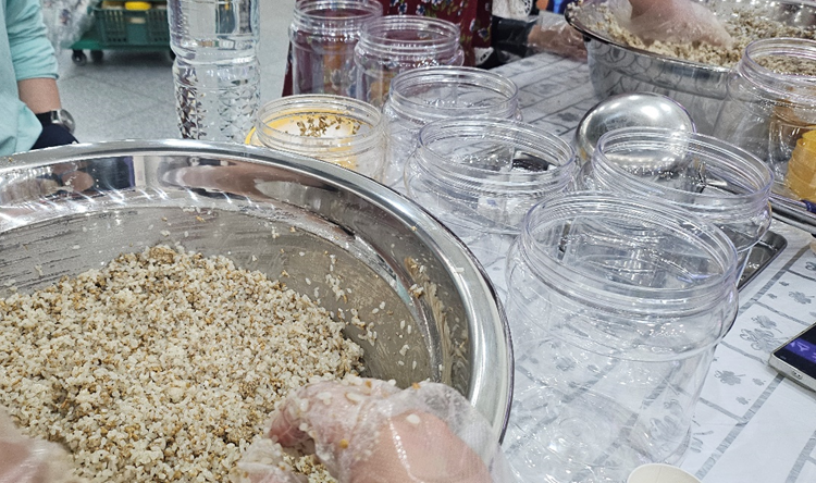 마지막으로 직접 막걸리를 만들어보는 체험이 있었습니다. 막걸리는 고두밥과 누룩을 섞어서 물을 넣고 발효를 시킨 후 발효가 끝나면 체에 거르고 물을 섞어서 만드는데, 막걸리 발효에 시간이 걸리기 때문에 ‘금정산성 막걸리’에서 만들어 온 고두밥과 누룩을 섞는 과정까지 하고, 발효가 끝난 막걸리 원액을 체에 거르고 물에 타서 완성하는 과정을 따로 나누어서 진행했습니다. 그래서 체험이 끝난 후 발효 전 상태의 막걸리와 완성된 막걸리 한 병을 얻을 수 있었습니다.