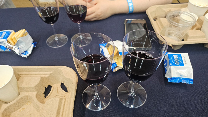 이후 와인 클래스에서는 간단히 기초적인 와인에 대한 상식과 ‘Cabernet Sauvignon’과 ‘Pinot Noir’를 중점적으로 두 품종으로 만든 와인의 특징과 차이점에 대해서 알아보는 시간을 가졌고, 각 와인들을 직접 마셔보는 시간도 가질 수 있었습니다. 두 포도 종으로 만들어진 와인 중에서 ‘Cabernet Sauvignon’은 좀 더 바디감과 떫은맛인 탄닌감이 강하고 블루베리와 같은 검은색 과일향이 나는 특징이 있고, ‘Pinot Noir’는 좀 더 묽은 느낌에 산도가 강하고 산딸기와 같은 붉은색 과일향이 나는 특징이 있다고 합니다.