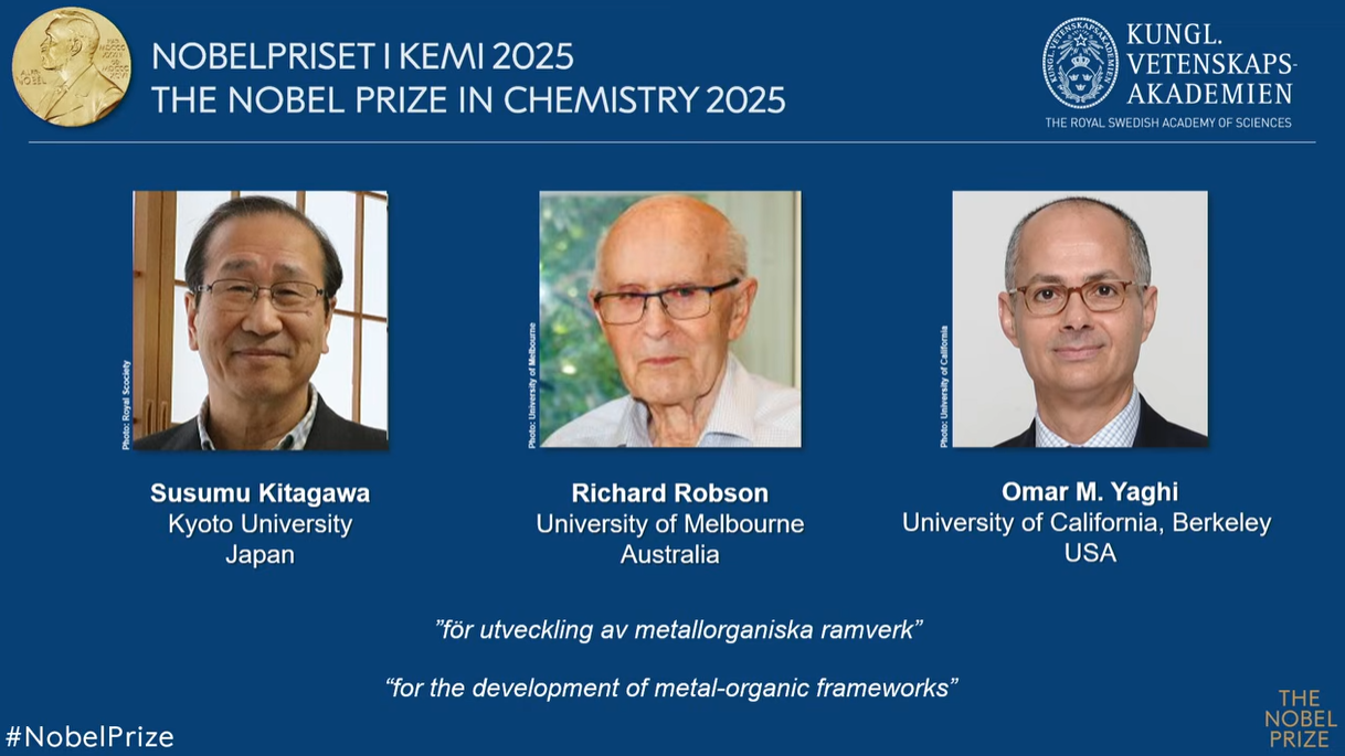 올해 노벨 화학상은 금속-유기 골격체(MOF)를 개발한 일본, 호주, 미국의 세 과학자에게 주어졌습니다.