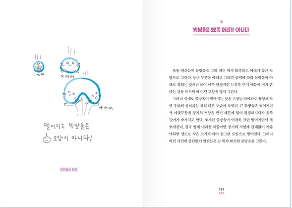 제가 읽은 이지사이언스 지구편은 6개의 장마다 12-13개의 주제로 구성되어 있습니다. '24시간 합주하는 화산', '혹돔은 모두 암컷으로 태어난다', '진딧물의 출산 정책' 등 제목만 보아도 흥미로운 여러 가지 주제를 다루고 있습니다. 주제 뿐 아니라 이지사이언스 시리즈의 또 하나의 흥미로운 점은 특이한 책 구성입니다. 책을 펼치면 왼쪽 장에는 오른손이 부러져 왼손으로 그린 작가님의 재치 있는 그림이 있고, 오른쪽 장에는 위트 넘치는 과학 글이 짧게 적혀 있습니다. 한 장의 짧은 글은 독자들이 과학을 재미있게 접근할 수 있도록 쉽게 쓰여 있으면서도 다양한 최신 과학 지식과 더불어 인문학적 상상력을 함께 고민할 수 있게끔 합니다.