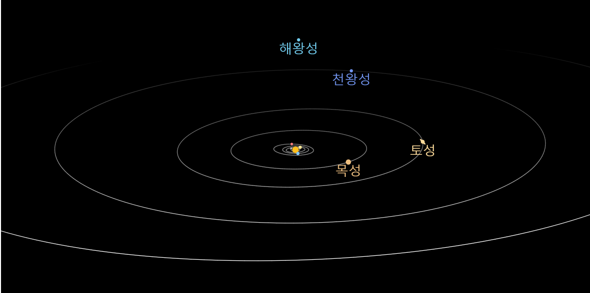 위 그림에서 가운데 큰 주황색 원이 태양으로 가까이에 돌고 있는 4개의 원이 각각 수성, 금성, 지구, 화성입니다. 그림에서 보면 지구는 목성이나 토성에 비해 태양과 매우 가깝게 위치한다는 것을 알 수 있습니다.