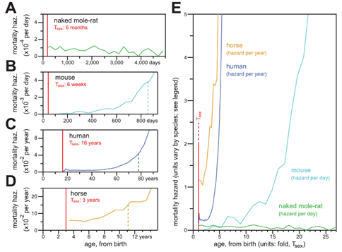 벌거숭이 두더지쥐를 통해 그들의 사망위험은 다른 포유류와 달리 나이가 들어도 증가하지 않는다는 연구결과를 발표하였다. 즉, 인간을 포함한 포유동물의 사망 위험은 나이가 들어감에 따라 기하급수적으로 증가한다는 1825년 영국의 수학자 곰페르츠에 의해 발견된 곰페르츠의 법칙에 위배되는 연구 결과이다. 두더지쥐는 생후 6개월 이후 평생 동안 동일한 사망률을 유지하거나 심지어 약간 더 낮아지는 경향을 보인다고 밝혔다. 이를 통해 DNA repair 기능과 샤페론에 주목하고 있다.