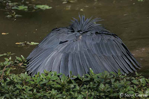 위 사진을 보면 우산이 엎어져 있는 듯한 형체가 보입니다. 언뜻 보면 절대 새라고 생각할 수 없는 이 형체의 정체는 바로 아프리카 왜가리의 일종인 검은해오라기(Egretta ardesiaca)입니다.