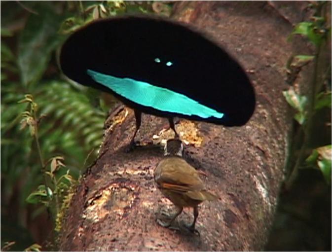 갈색의 암컷 앞에 있는 검은 형태가 바로 수컷 어깨걸이 극락조입니다.