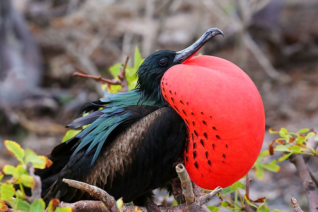 그 중 열대 및 아열대 지방에 서식하는 군함조(Fregatta ariel )는 강렬한 빨간색의 공기낭을 이용해 구애를 하는 것으로 잘 알려져 있습니다. 군함조의 수컷은 번식할 때가 되면 번식지에 먼저 내려가 암컷을 기다리다 하늘에 암컷이 보이면 공기를 들이마셔 목 아래에 있는 공기낭을 크게 부풀립니다. 그리고는 목을 부풀린 채로 부리를 이용하여 또르르륵 나무 구슬이 굴러가는 듯한 소리를 내며 구애행동을 합니다. 아래 영상을 통해 수컷 군함조가 암컷을 부르는 소리를 들어볼 수 있습니다.