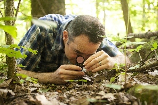 <만다라>는 우주 법계의 온갖 덕을 망라한 진수를 그림으로 나타낸 불화(佛畵)의 하나입니다. 극히 작은 것에서 우주를 탐구하듯, 저자는 실제 만다라만한 면적의 땅에서 숲의 모든 생태를 꼼꼼하게 뜯어봅니다. 매번 숲의 같은 장소를 찾아가 천천히 변하는 계절의 변화를 살펴보고, 돋보기로 아주 작은 곤충과 식물을 관찰하고, 아침을 깨우는 새소리에 귀를 기울이며 만다라의 모든 것을 관찰하고 느끼고 체험합니다. 위의 사진처럼 땅에 납작 엎드려 여러가지를 관찰하며 이 책을 썼을 저자의 모습책을 읽으면서 자연스럽게 머리속에 그려집니다.