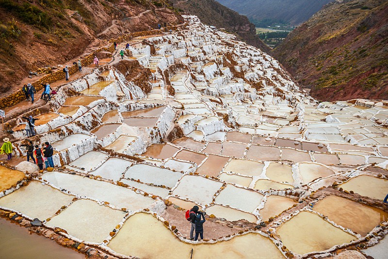 페루는 염전도 계단식입니다. 모레이 근처에 있는 마라스는 해발 3,200m에 있는 염전으로, 반듯반듯한 네모 모양의 염전이 매우 인상깊습니다. 어떻게 바다가 아니라 산 한가운데 염전이 있을 수 있는 걸까요? 남미 사람들은 저 소금물을 어떻게 퍼 온 것일까요? 사실 이 염전은 바닷물로 만든 것이 아니라 땅에서 소금물이 솟아나는 것입니다.