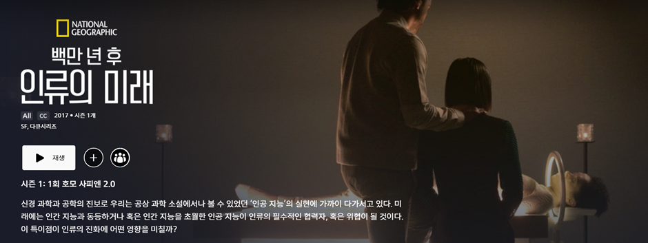 <백만 년 후 인류의 미래>는 내셔널 지오그래픽 다큐멘터리로, 먼 미래에 특정 과학 기술이 매우 발전하면 어떻게 될까에 대한 내용을 담고 있습니다. 현재 1개 시즌에 6개의 회차가 있으며, 이번에는 그중 1화인 ‘호모 사피엔 2.0’의 리뷰를 진행하려고 합니다.